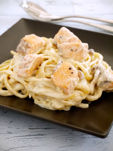 パスタは旬の鮭を使い、生クリームを使わずに、